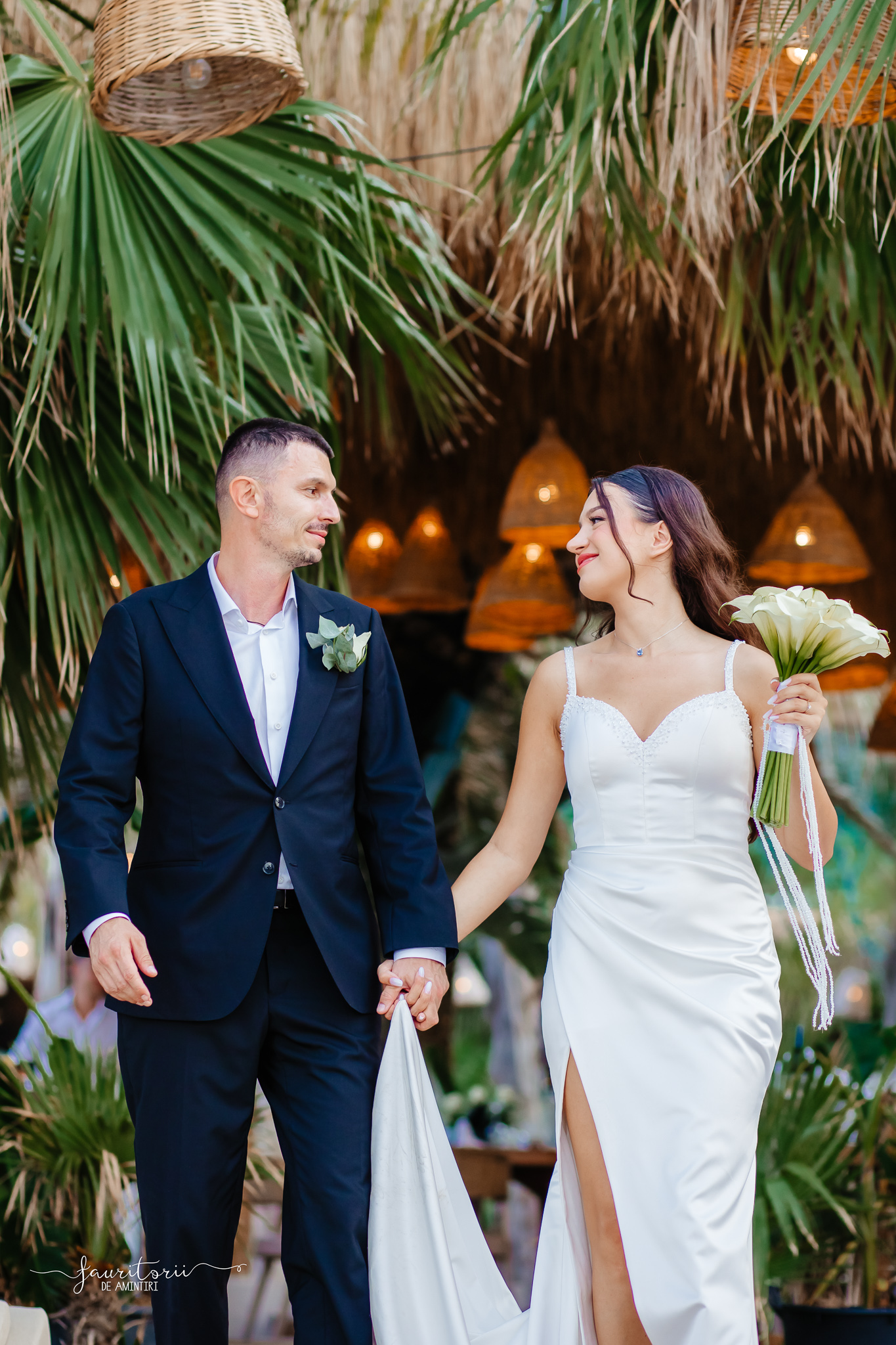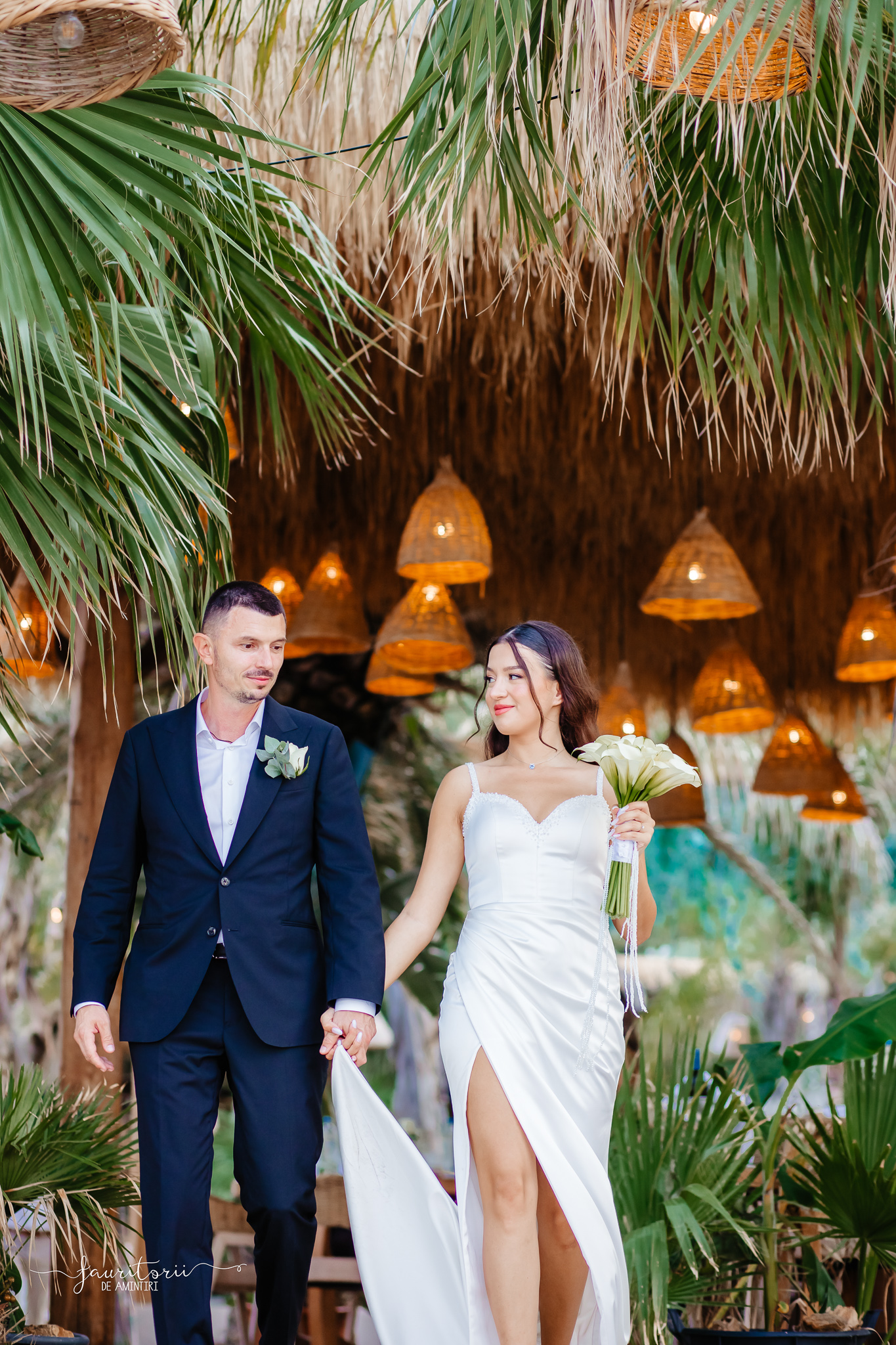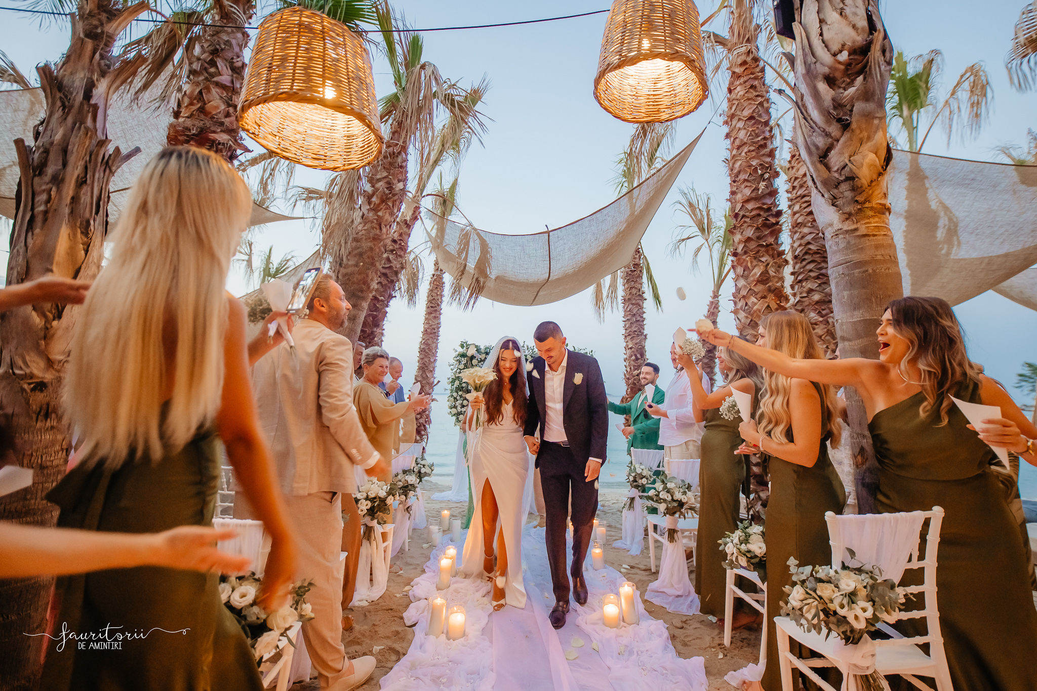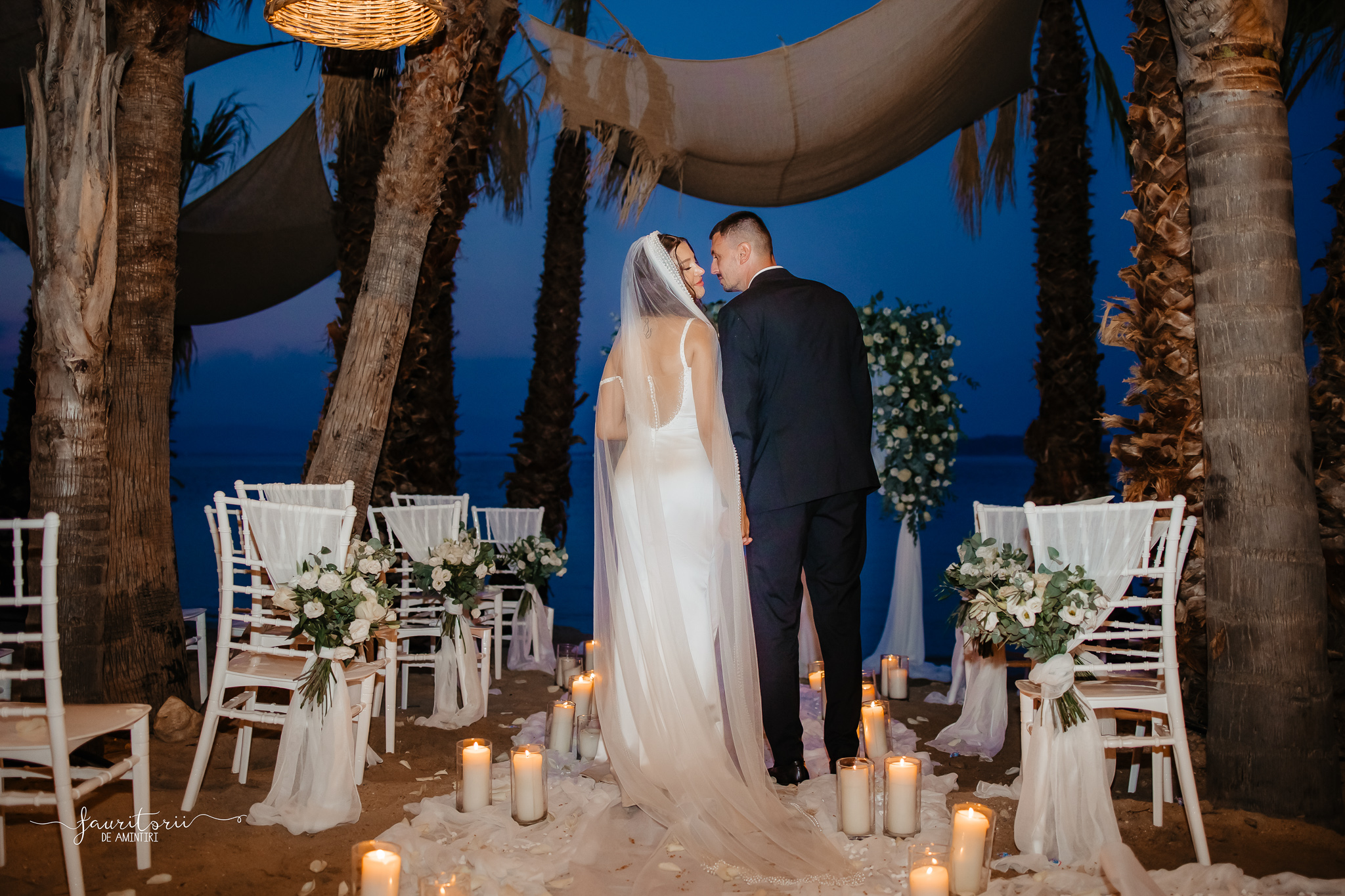 Some weddings are perfectly in tune with their setting — and this late August celebration on the island of Thassos was exactly that. A Romanian couple, roughly 100 guests, the warm end-of-summer light of the northern Aegean, and a ceremony held among palm trees on the edge of the sea. Everything felt inevitable, in the best possible way.