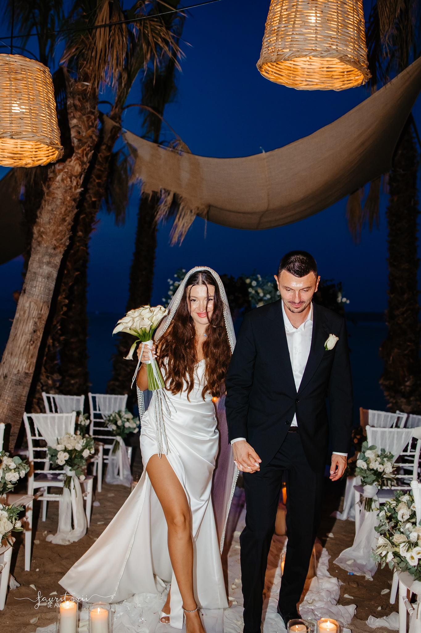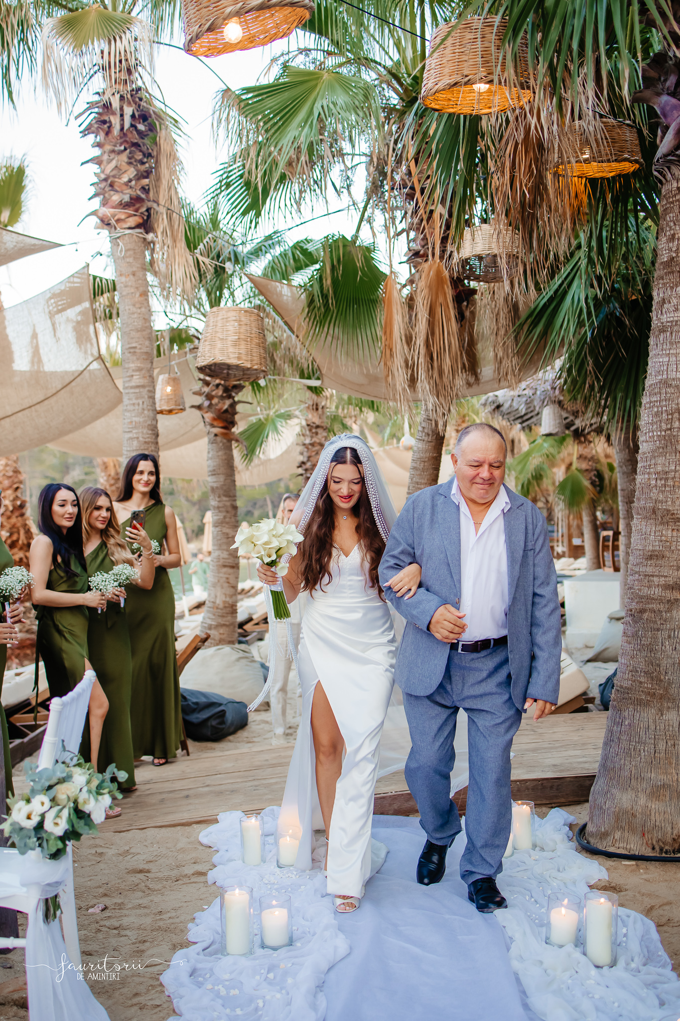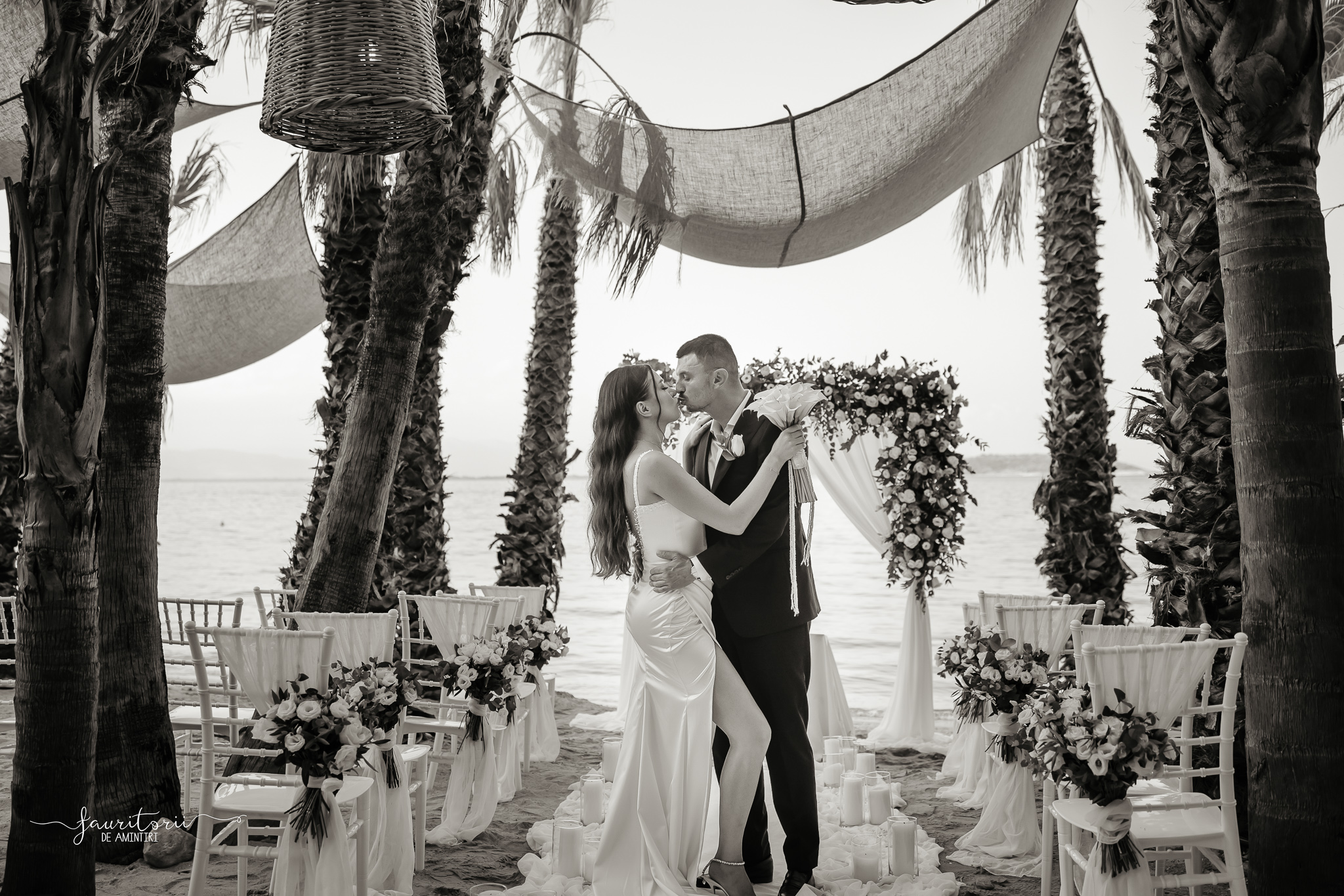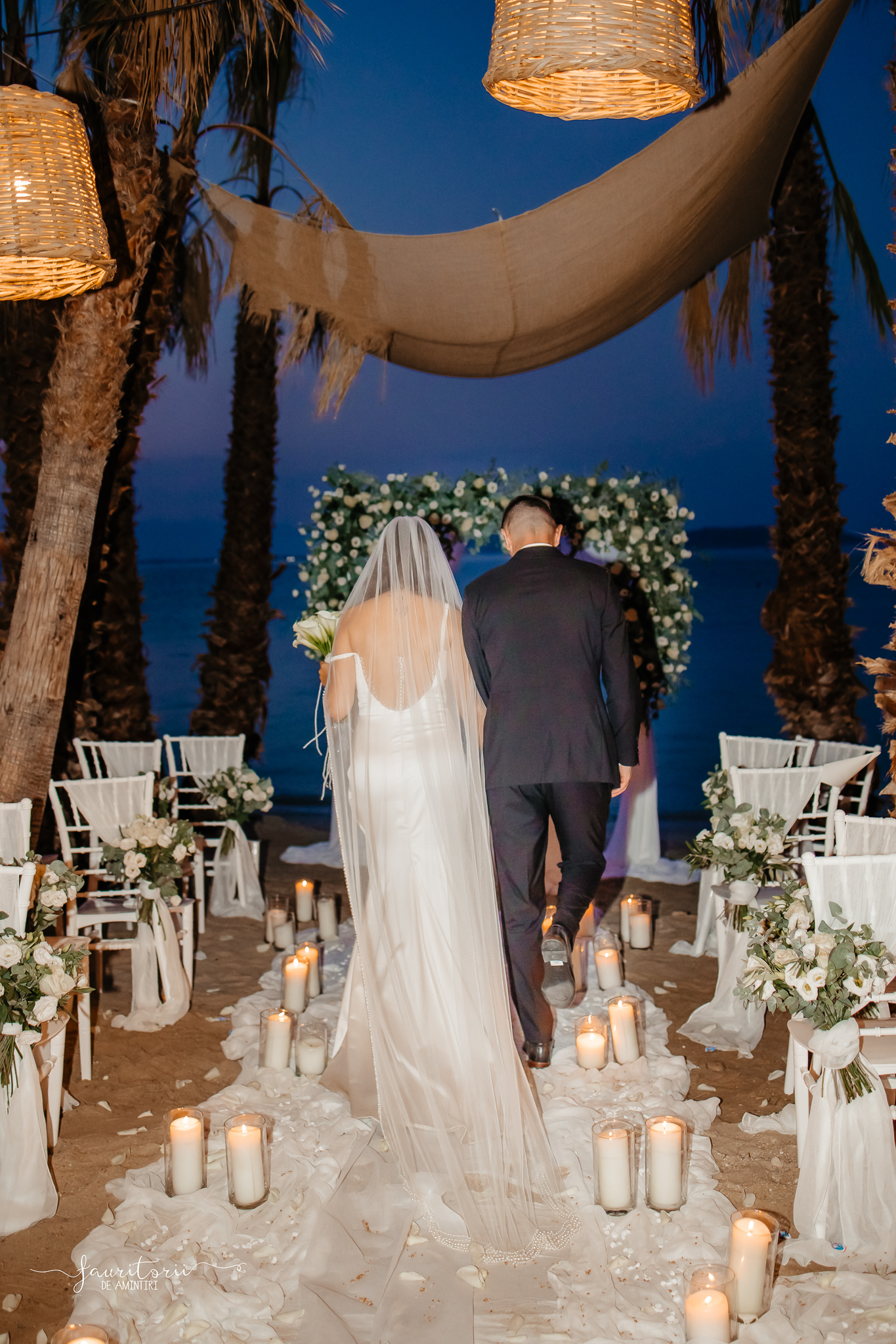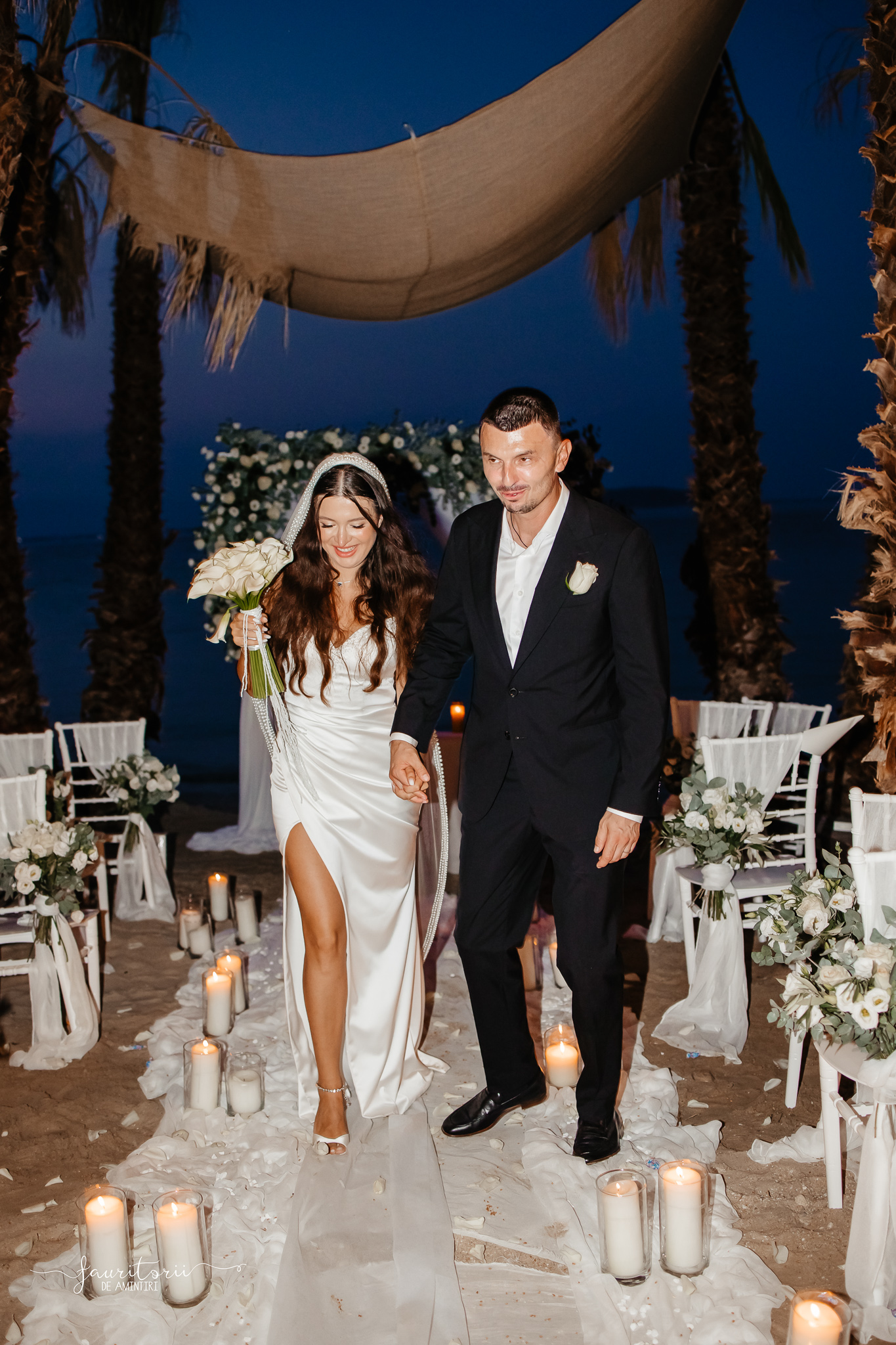 Some weddings are perfectly in tune with their setting — and this late August celebration on the island of Thassos was exactly that. A Romanian couple, roughly 100 guests, the warm end-of-summer light of the northern Aegean, and a ceremony held among palm trees on the edge of the sea. Everything felt inevitable, in the best possible way.