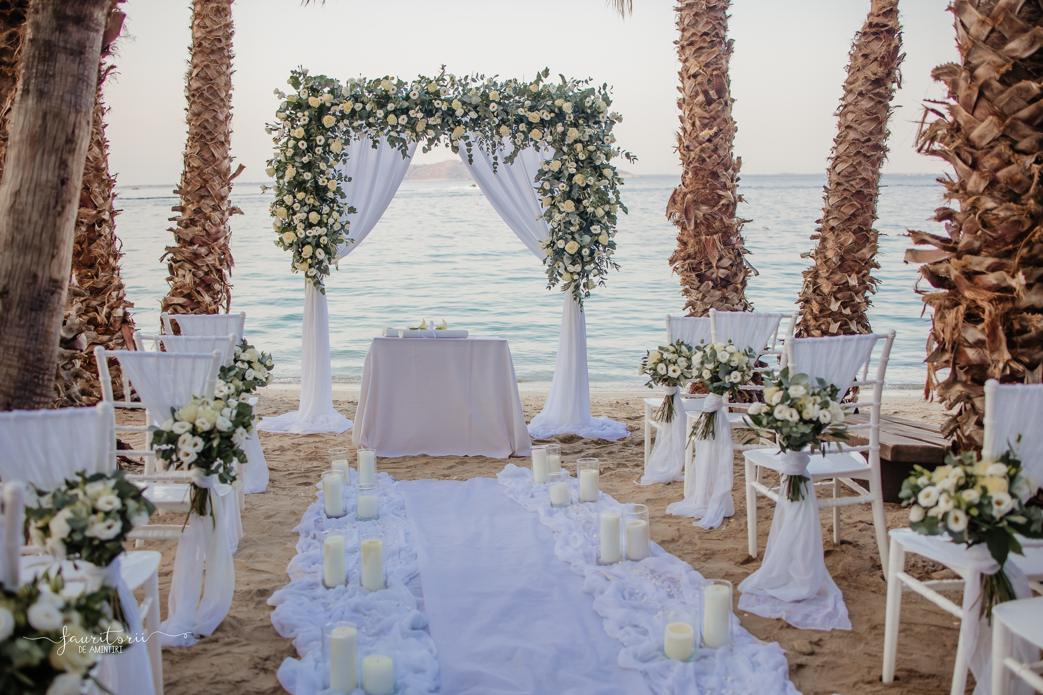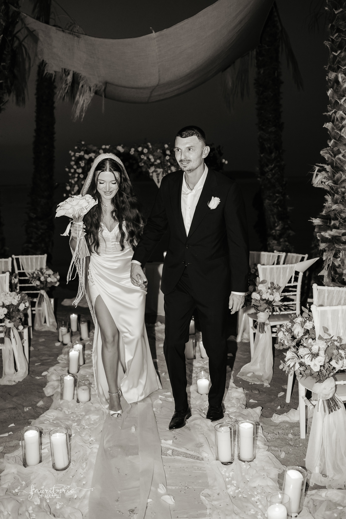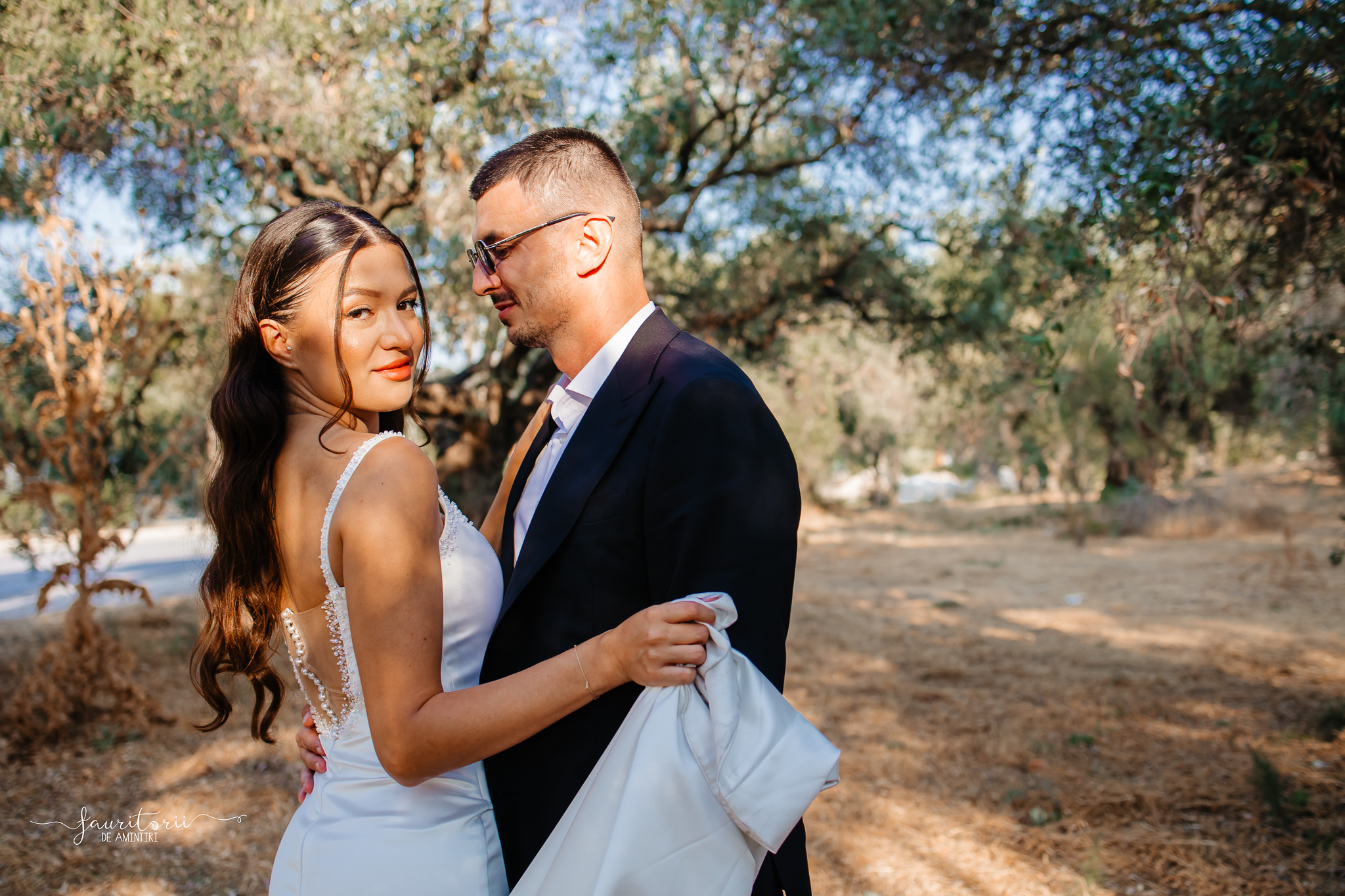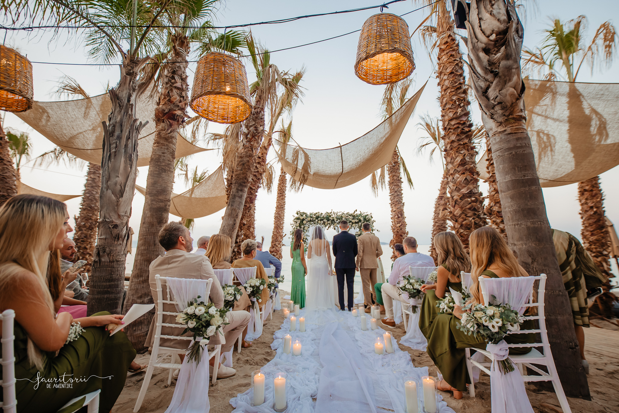 Some weddings are perfectly in tune with their setting — and this late August celebration on the island of Thassos was exactly that. A Romanian couple, roughly 100 guests, the warm end-of-summer light of the northern Aegean, and a ceremony held among palm trees on the edge of the sea. Everything felt inevitable, in the best possible way.
