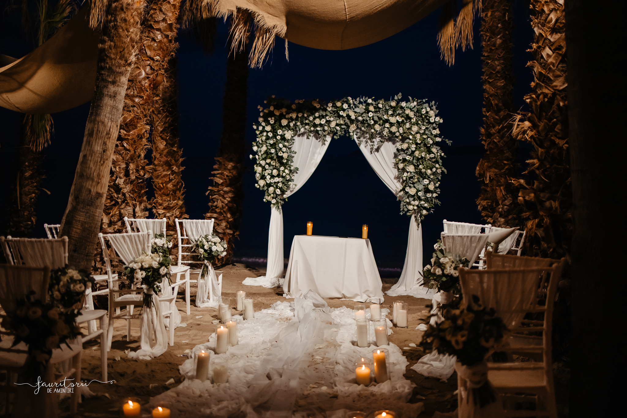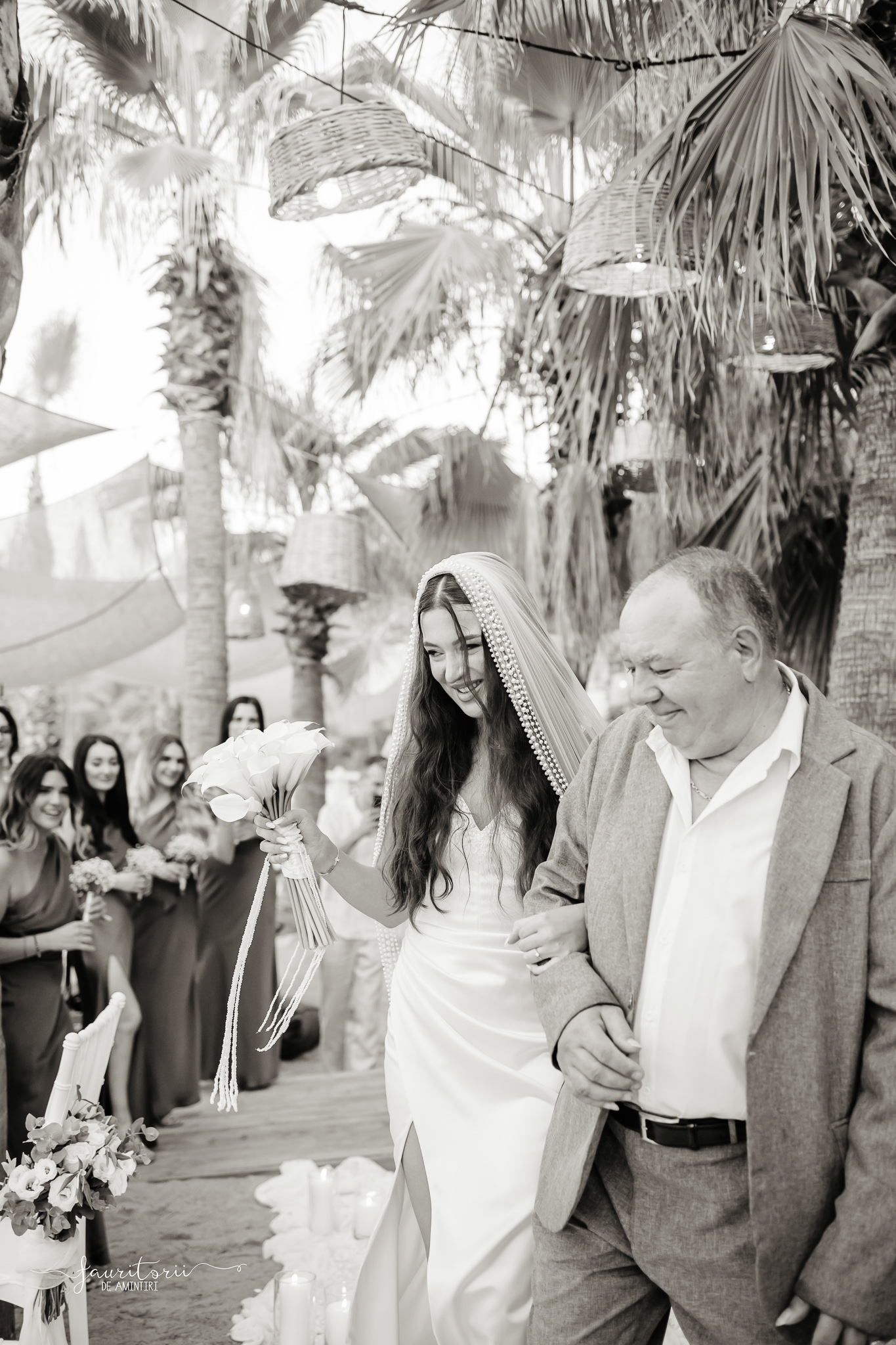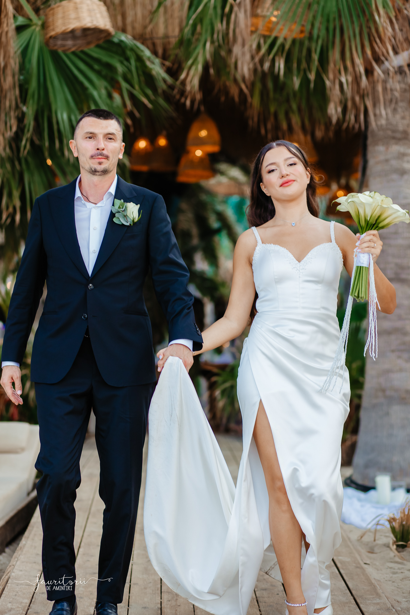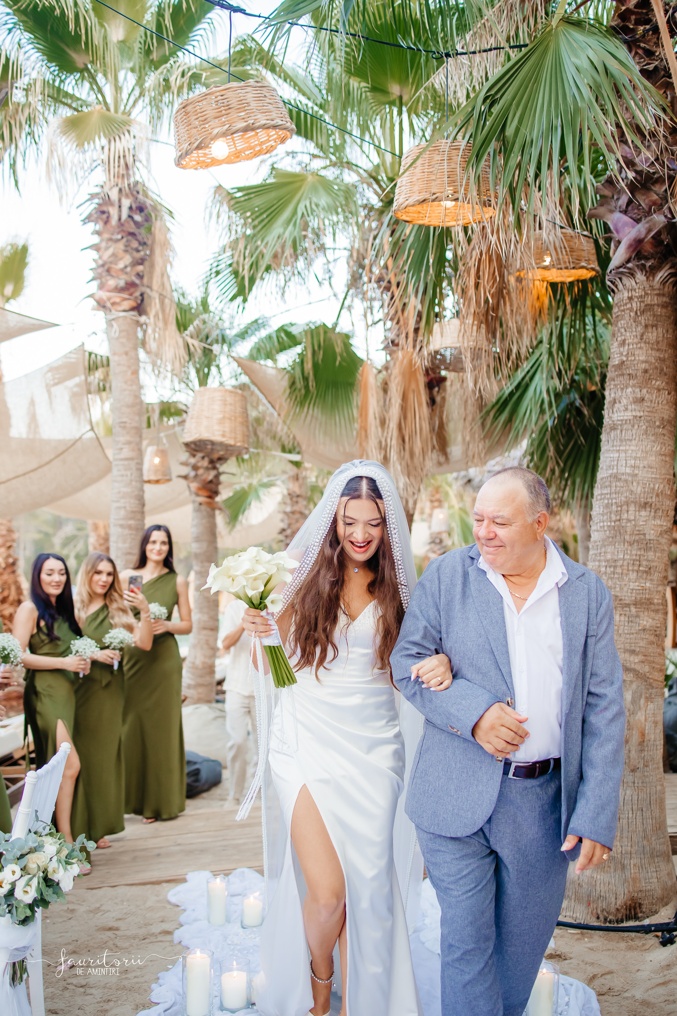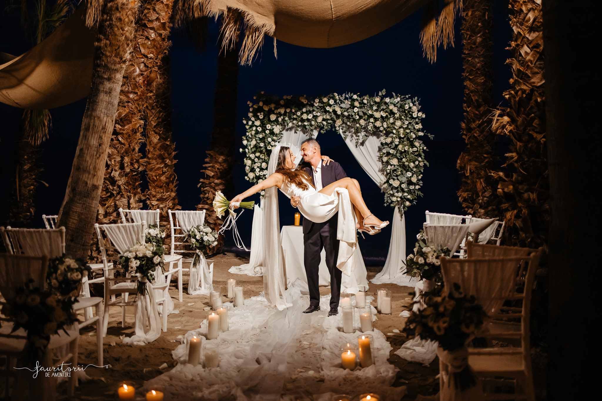 Some weddings are perfectly in tune with their setting — and this late August celebration on the island of Thassos was exactly that. A Romanian couple, roughly 100 guests, the warm end-of-summer light of the northern Aegean, and a ceremony held among palm trees on the edge of the sea. Everything felt inevitable, in the best possible way.