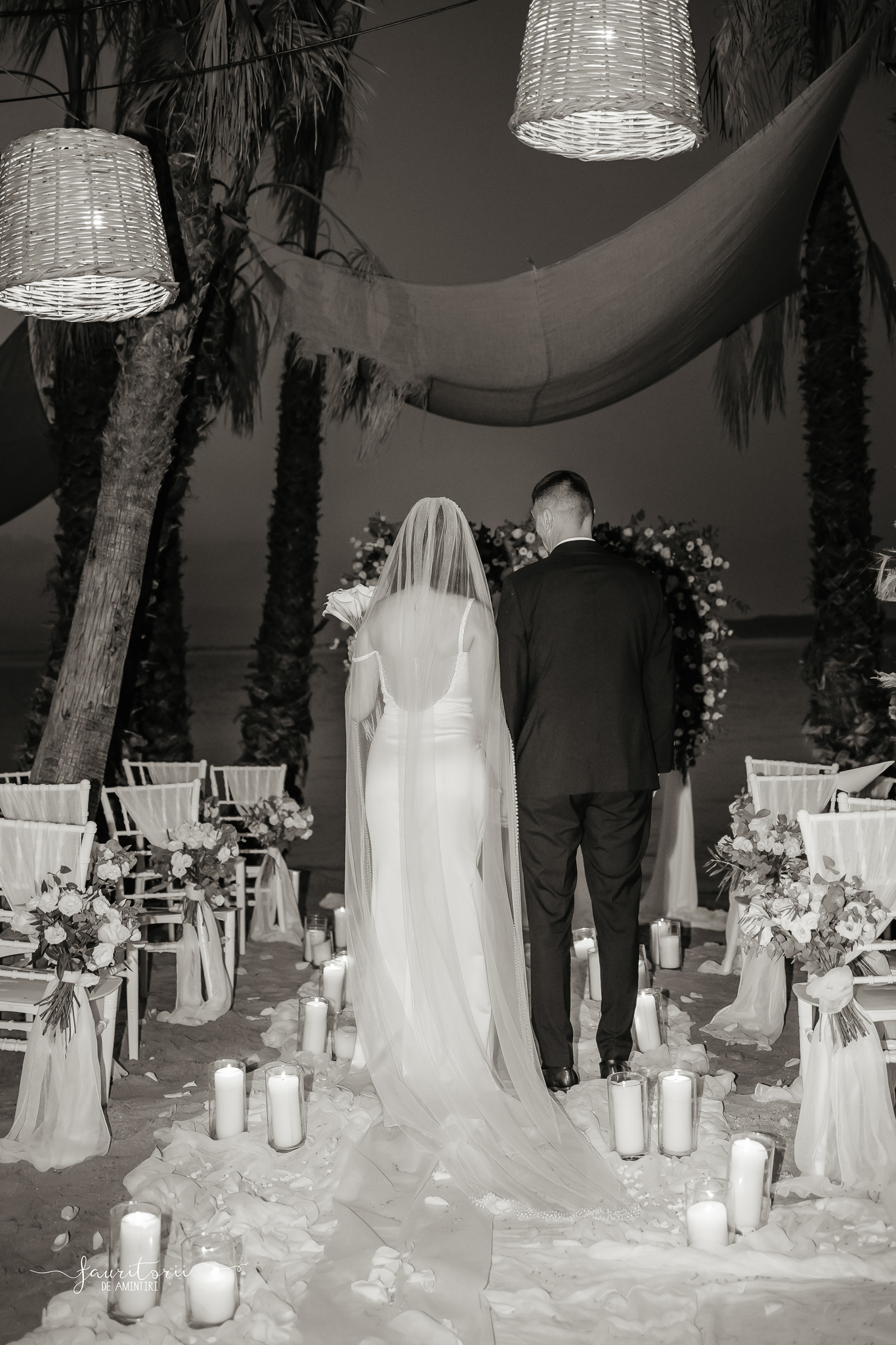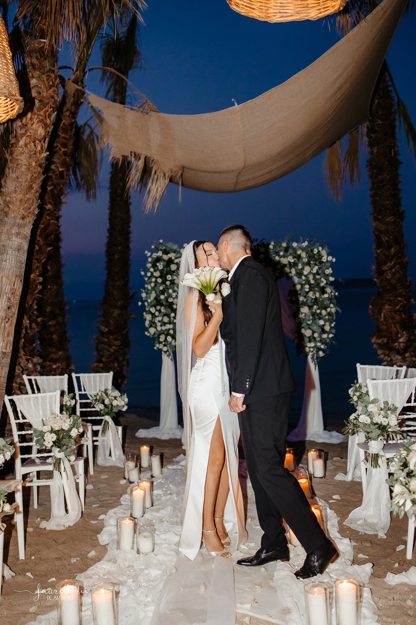 The ceremony unfolded at golden hour, among the palms, with the sea as witness. As the sun began to lower over the Aegean, the warm light did what only late-summer Mediterranean evenings can do — it turned everything golden. The couple, their guests, the flowers, the water. All of it.
