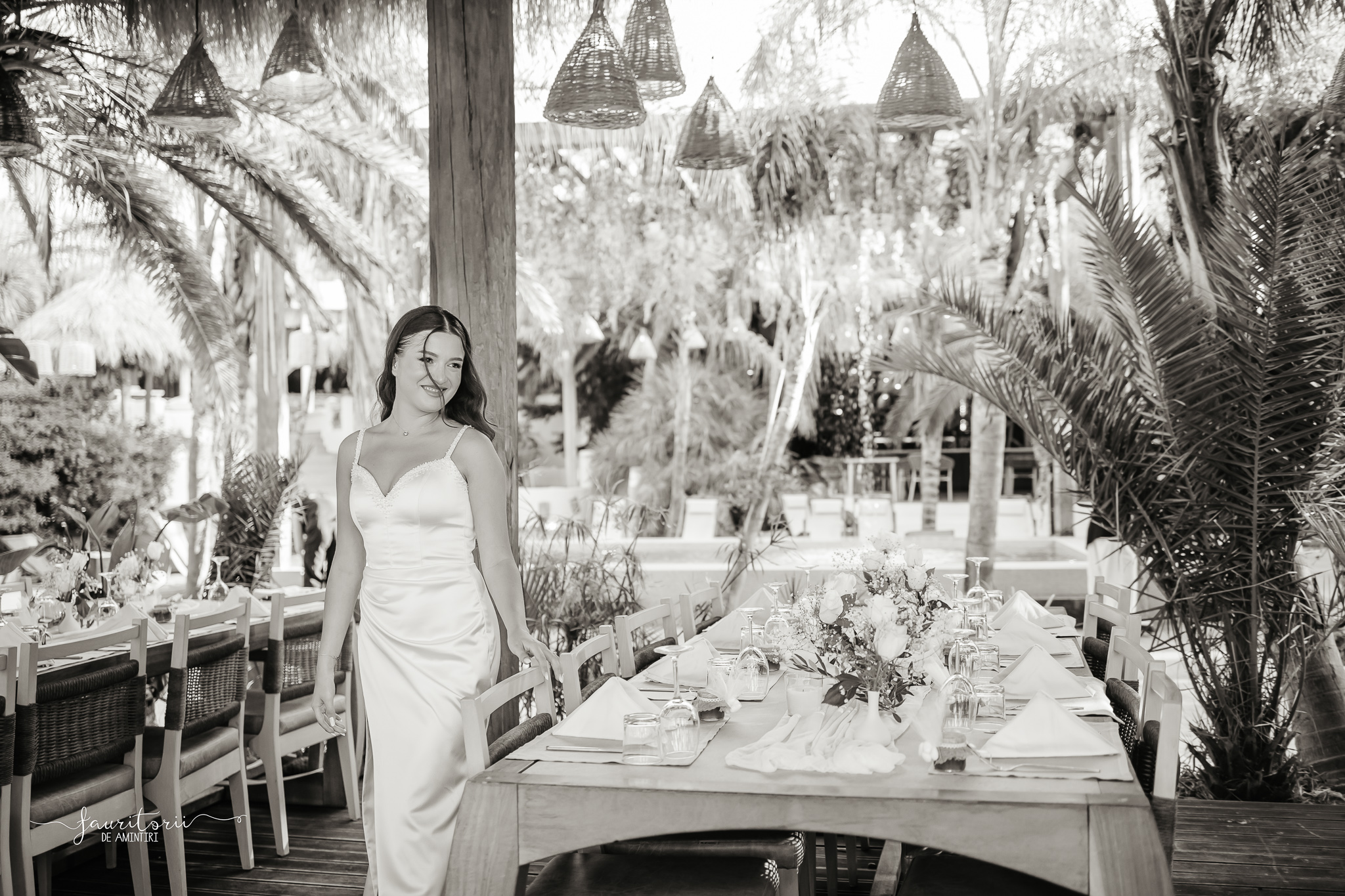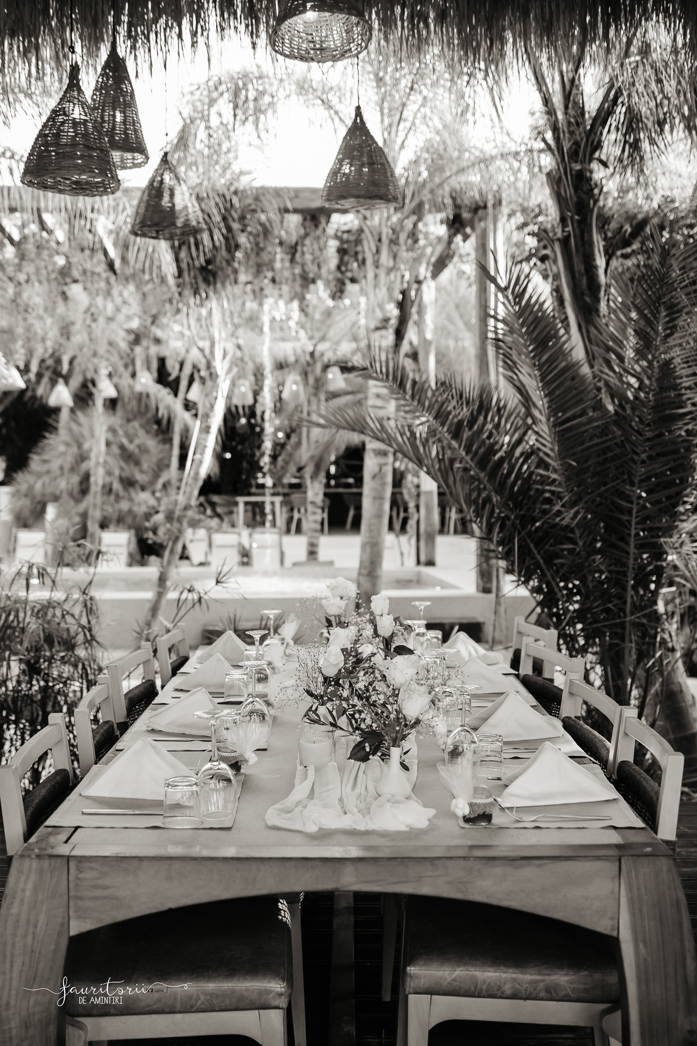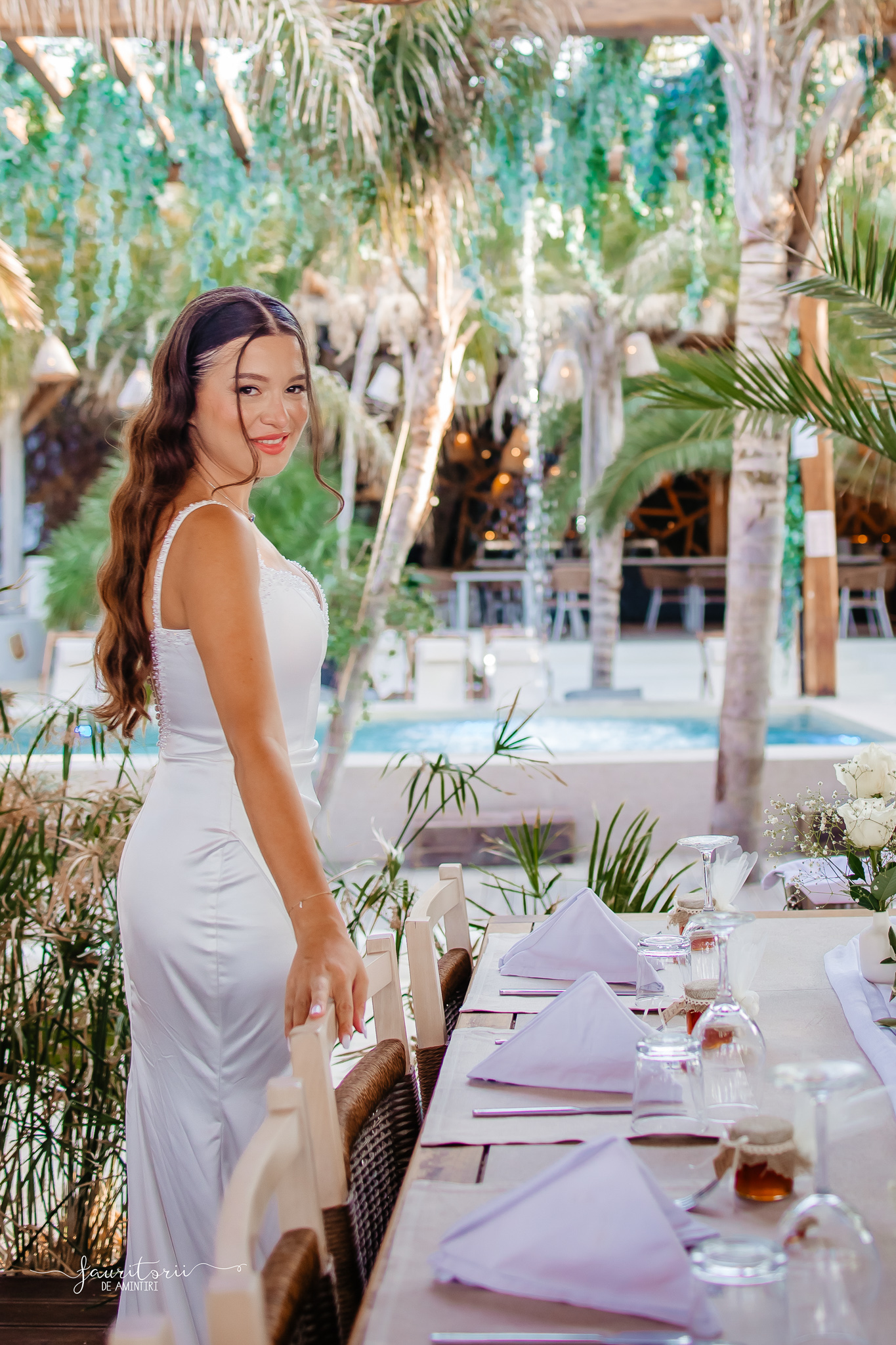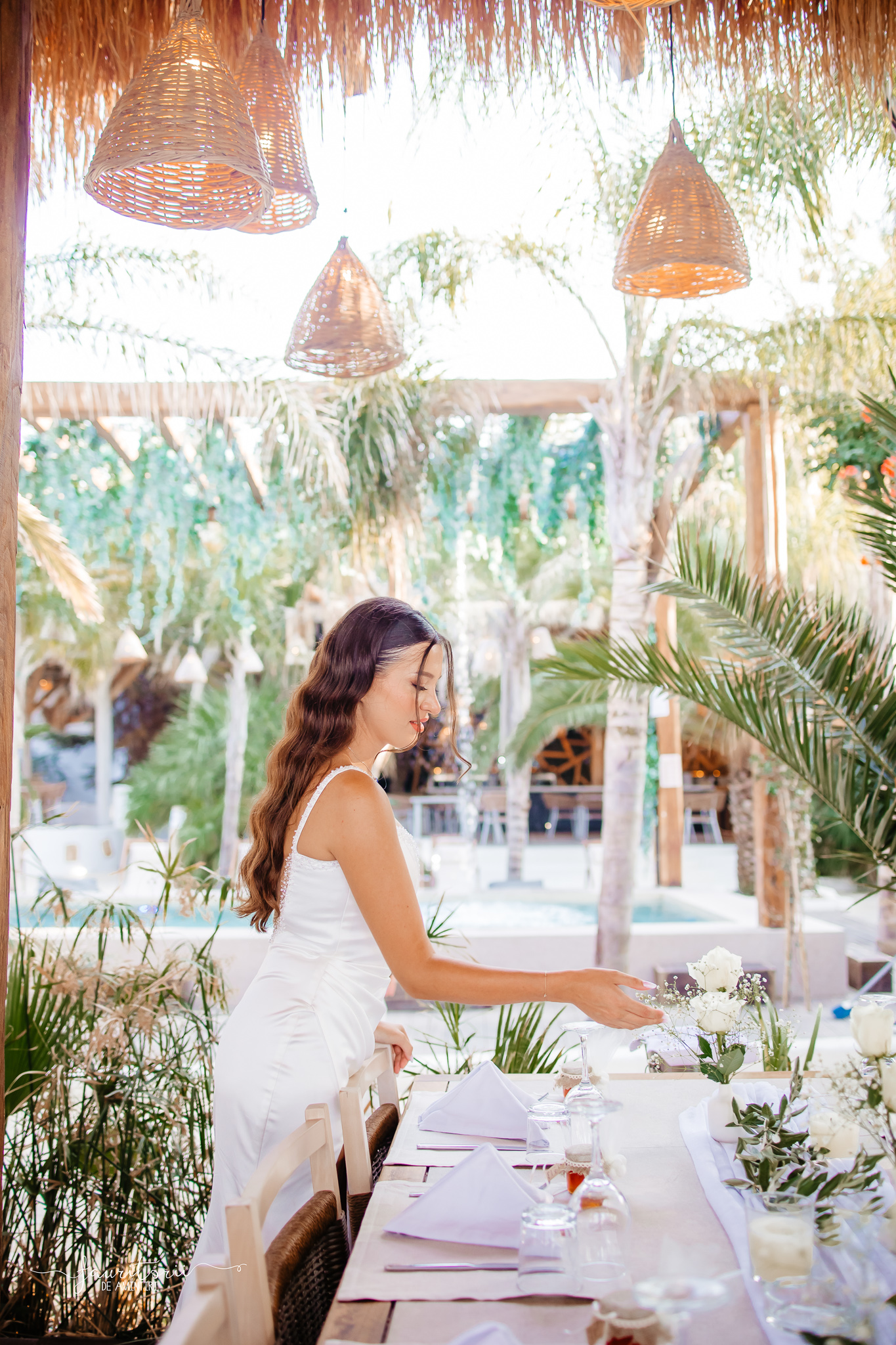 The venue was La Scala Beach, near Limenas on the northern coast of Thassos — one of the island’s most sought-after locations for destination weddings. Surrounded by natural wood, lush greenery, and fine sand, La Scala sits where the beach meets the Mediterranean imagination. The palm-lined ceremony space, with the Aegean stretching out beyond it, created the kind of backdrop that needs no decoration to be extraordinary.