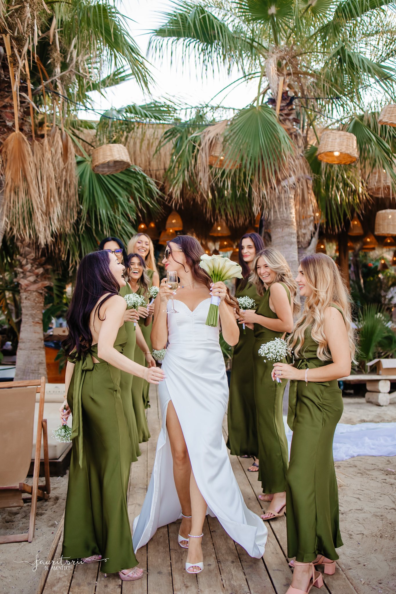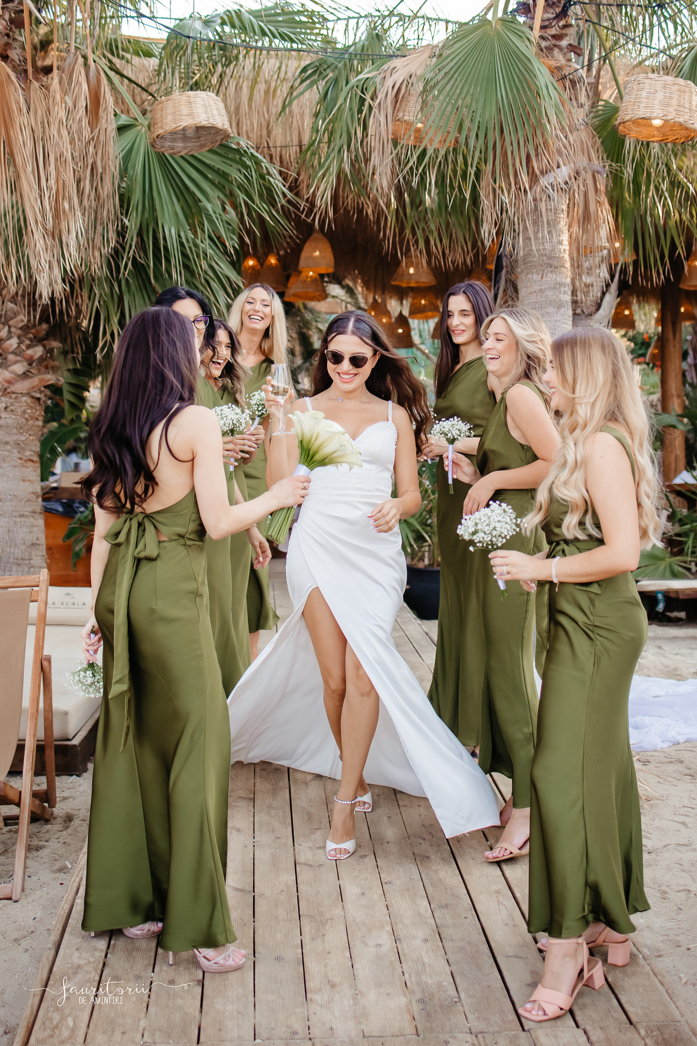The aesthetic was warm, understated, and deeply Mediterranean. The bridesmaids wore olive-toned dresses that echoed the island’s dense pine forests. The bride carried a simple white calla lily bouquet — clean, elegant, nothing excessive. Her dress followed the same philosophy: light, fluid, effortlessly fitting for a seaside wedding yet unmistakably refined. She looked like she belonged there.